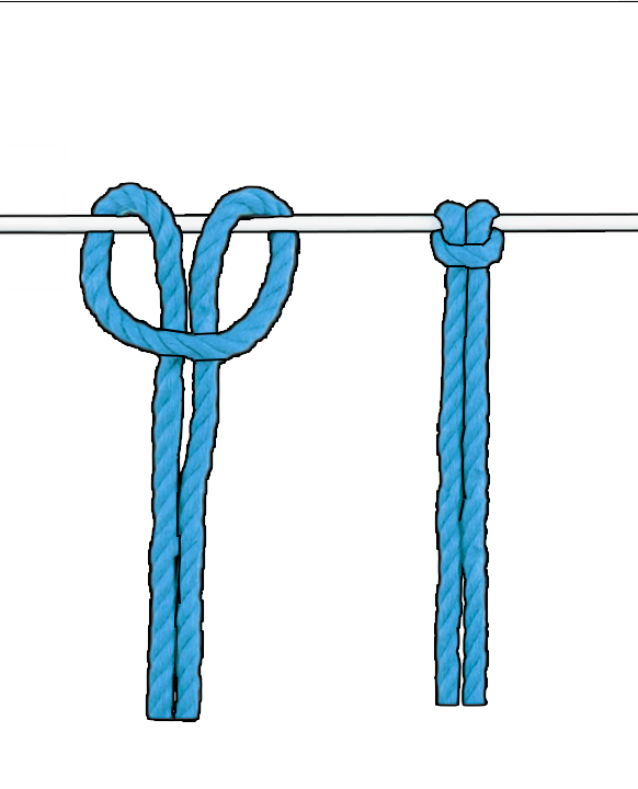 Der Ankerknoten, auch bekannt als Ankerstich, Lerchenkopfknoten oder Startknoten, ist der grundlegende Knoten, mit dem die meisten Makrameeprojekte beginnen. Er dient dazu, das Garn sicher an einem Trägerobjekt, wie einem Stab oder -ring, zu befestigen.