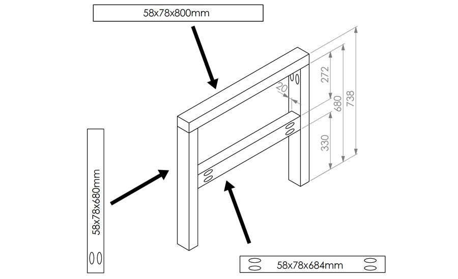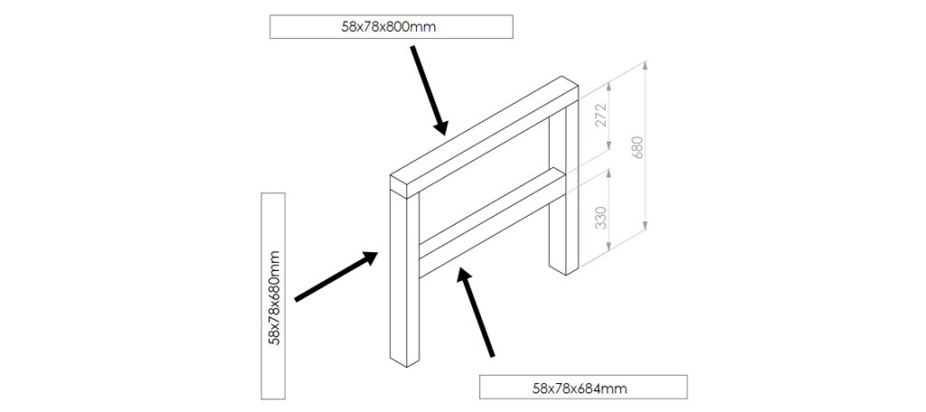 1. – Für die Armlehnen benötigen wir die Kanthölzer (58mm x 78mm) in den Längen 800mm, 680mm und 684mm.
