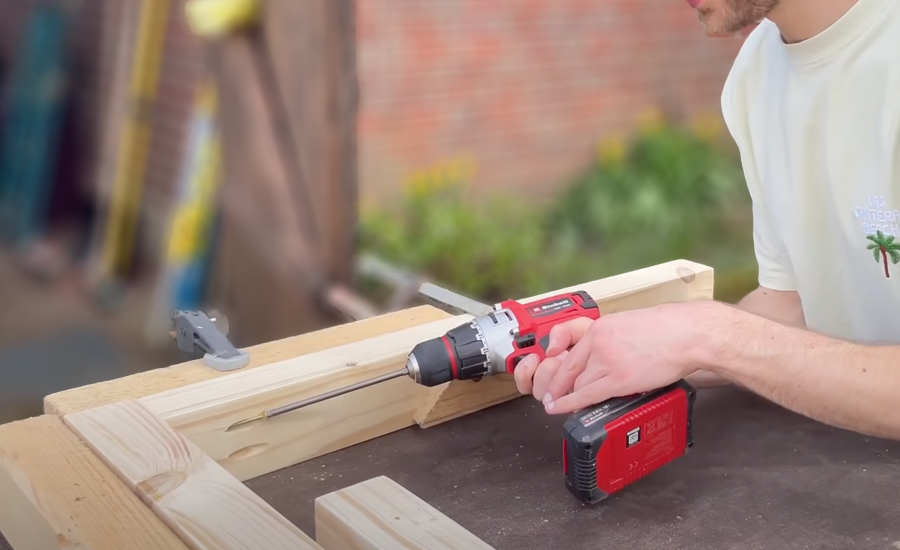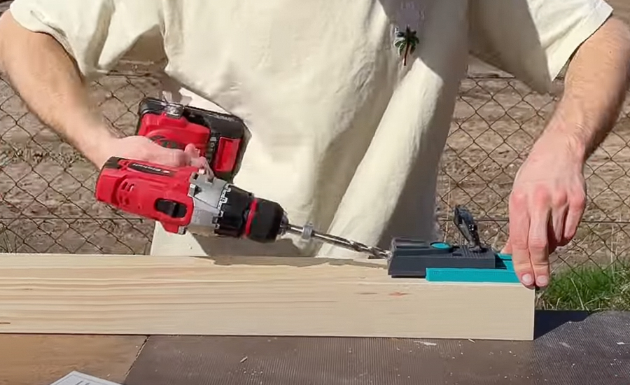 Weiter gehts mit den vier Kanthölzern mit der Länge 680mm. Ich bohre mithilfe der Bohrhilfe auf einer Seite des Holzes zwei schräge Löcher in jedes Stück. Diese Löcher dienen dazu, die Schrauben, mit denen wir die Kanthölzer zusammenschrauben, zu verstecken, sodass sie von außen nicht sichtbar sind.