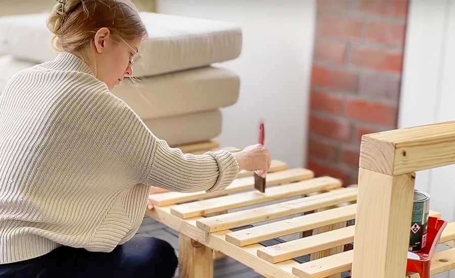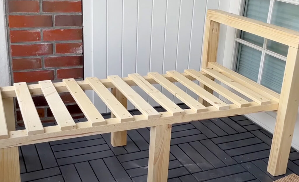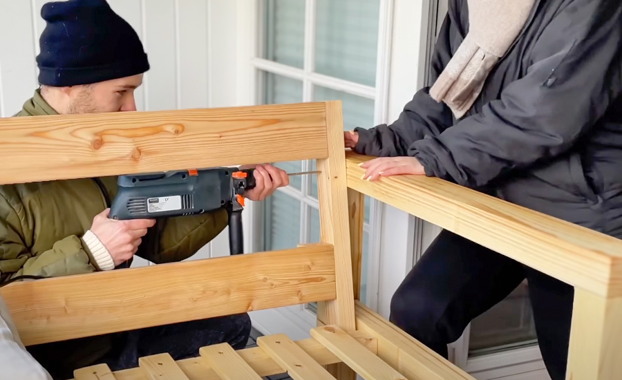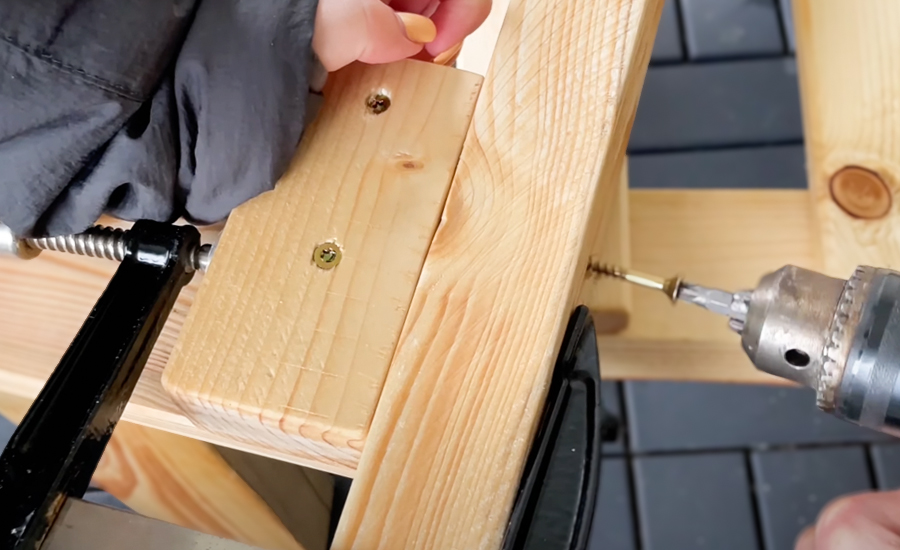 Diese werden nun auch geschliffen und anschließend an die Beine der Sitzfläche geschraubt. Tipp: Um Rissbildung zu verhindern, ist es sinnvoll, vorher kleine Löcher in den Latten zu bohren und anschließend dann auf die Sitzfläche.