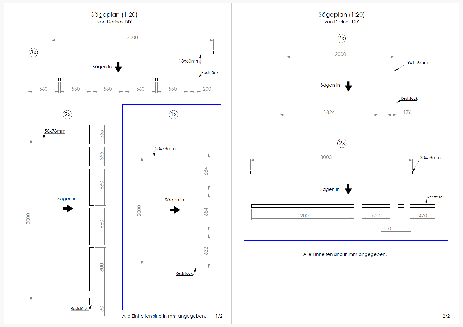 Wir haben das Holz selbst mit der Kappsäge zurechtgesägt. Das Sägen im Baumarkt ist kostenlos und hätte uns einiges an Zeit gespart. Damit ihr das nicht müsst, habe ich hier einen genauen Sägeplan erstellt.