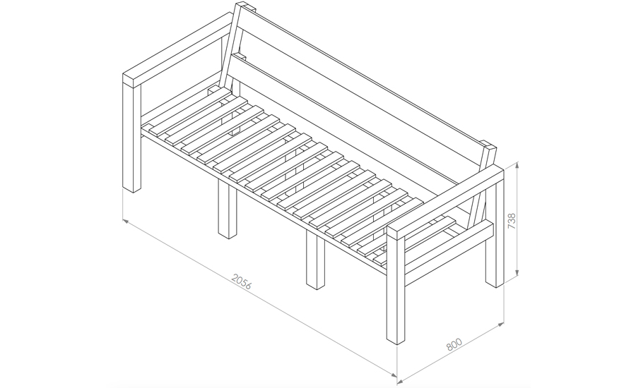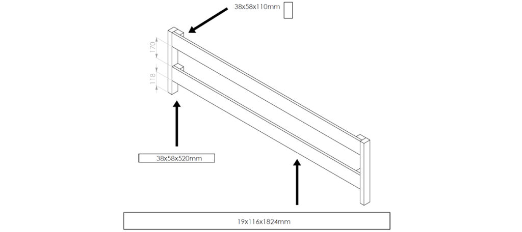 1. – Zweidrittel des Outdoor Sofas sind nun geschafft. Für den letzten Teil benötigen wir zwei Holzlatten (19mm x 116mm) mit der Länge 1795mm, vier Kanthölzer (38mm x 58mm) mit der Länge 110mm und zwei Hölzer (38mm x 58mm) mit der Länge 520mm.