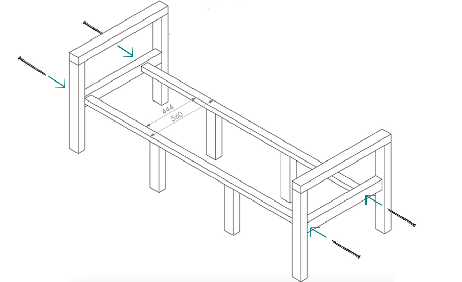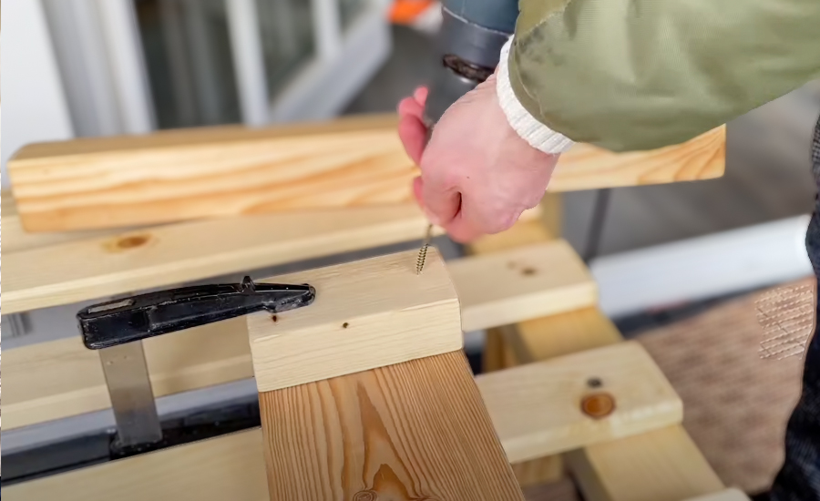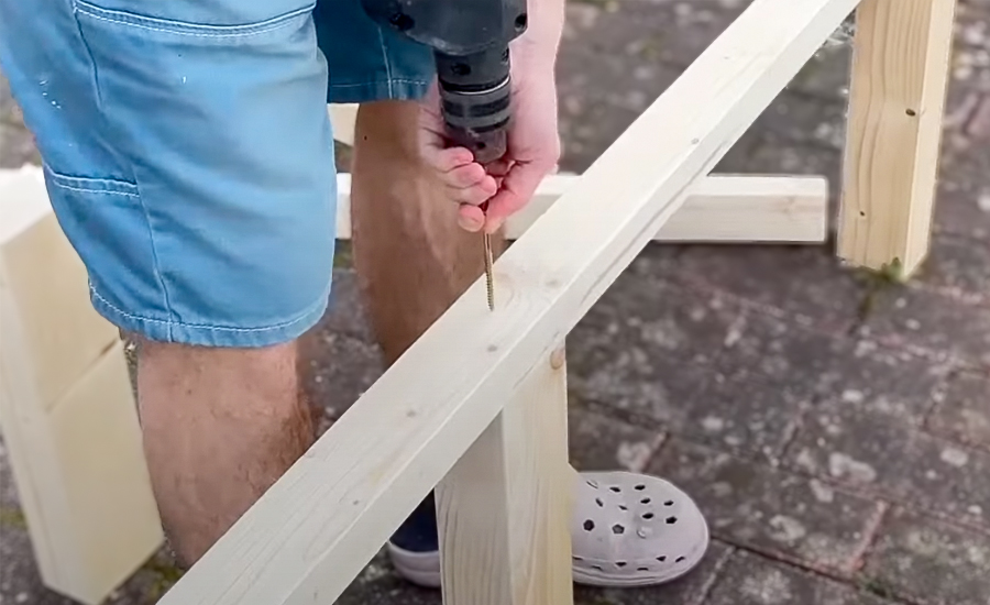 Nun können die kurzen Hölzer mit gleichmäßigem Abstand an die langen geschraubt werden. Dazu verwende ich auch hier Schrauben mit einer Länge von 60mm, die ich von oben durch das Holz bohre. Fertig sind nun die Beine der Sitzfläche.