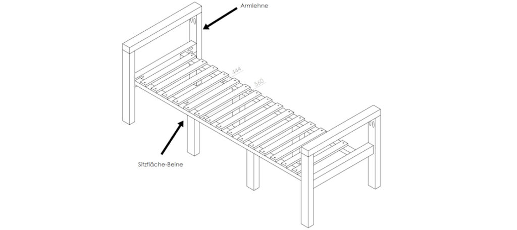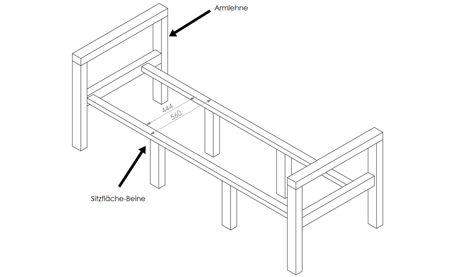 2. – Die Beine müssen jetzt an die Armlehnen geschraubt werden. Bohrt dazu je vier 100mm lange Schrauben durch das Holz der Armlehnen und der Beine der Sitzfläche.