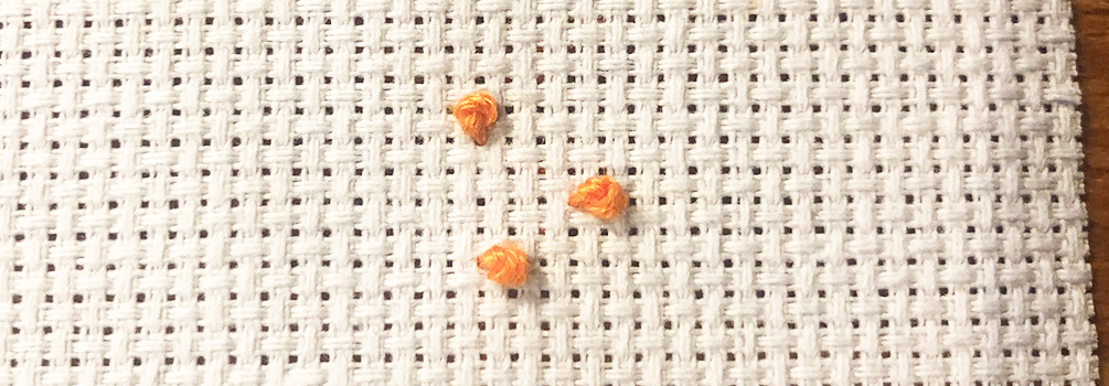 Die ersten zwei/drei Stiche die du danach machst werden zum Fixieren über den Faden gestickt. Der Rest des Fadens wird zum Schluss nochmal aufgenommen und auf der Rückseite des fertigen Motivs, durch einige bestehende Stiche gefädelt.