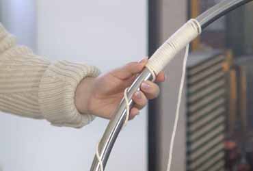 3.2. Im Uhrzeigersinn geht es zur nächsten Markierung, aber hier knote ich die Schnur nicht, sondern fädle sie einmal unter dem reifen und dann über den Reifen rechts an der Schnur vorbei.